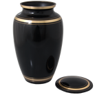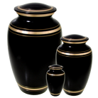 The Plain Black Gold Pet Cremation Urn is made of solid brass and is simply decorated with gold bands. The perfect choice for pet personalization because the black finish makes a striking contrast with the brass that is revealed from the engraving. A threaded lid keeps the cremated ashes secure. Offered in 3 sizes.