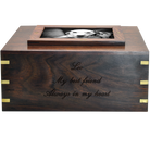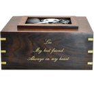 This handsome wood urn has a photo window on top to display your favorite photo of your furry friend. This urn has engraving options- engrave directly into the wood or engrave on a matching small or large plaque (refer to photos for samples). Clip art is also available for more personalization at an additional cost.