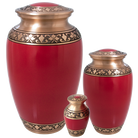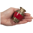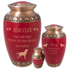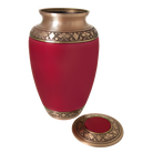 The Cherry Red Cremation Urn is made of solid brass. It is painted a beautiful shade of red with brass bands wrapping around the top and base of the urn. Each brass band is threaded with an elegant floral design. This simple yet classic urn is the perfect way to honor a furry family member. The threaded lid keeps the urn closed securely. Looks beautiful engraved!