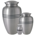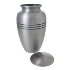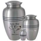 The Traditional Pewter Pet Cremation Urn is made of solid brass and is adorned with three black stripes for a classic design. Threaded lid for secure closure. This urn is a good option for custom personalization with options to add clip art like paw prints or even a photo. Available in 3 sizes to find the perfect fit for your pet's size.