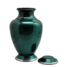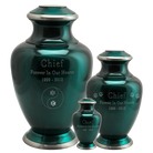 The Shiny Turquoise Pet Cremation Urn is a marine green and made of solid brass and looks brilliant when engraved. A winning combination of curved design and fetching sea green color with pewter details in a glossy finish. The urn is secured with threaded lid. 3 sizes to choose from for the perfect fit for your furry companion.